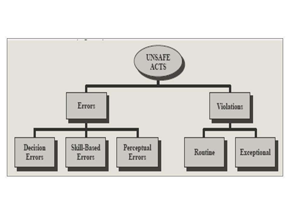 The Human Factors Analysis and Classification System (HFACS) menjelaskan kegagalan manusia dalam dua kategori (lihat gambar), yaitu: kesalahan (error) dan pelanggaran (violation). Kesalahan biasanya terjadi karena ketidakmampuan atau ketidaksengajaan karena kelalaian atau kealpaan seseorang yang berakibat pada kegagalan. Sedangkan pelanggaran adalah adanya faktor kesengajaan untuk mengabaikan peraturan sehingga terjadi kegagalan atau kecelakaan.